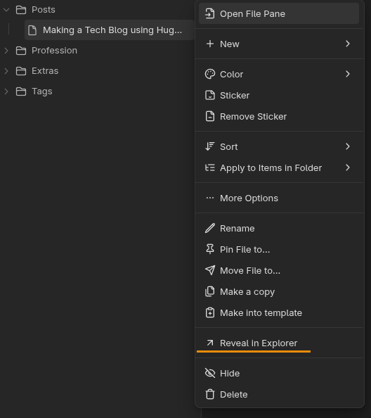 - You can start to write your posts in this directory, all you need now is the path to the directory. Right click the folder and select “reveal in explorer”. Keep a note of this path as we will need it later.